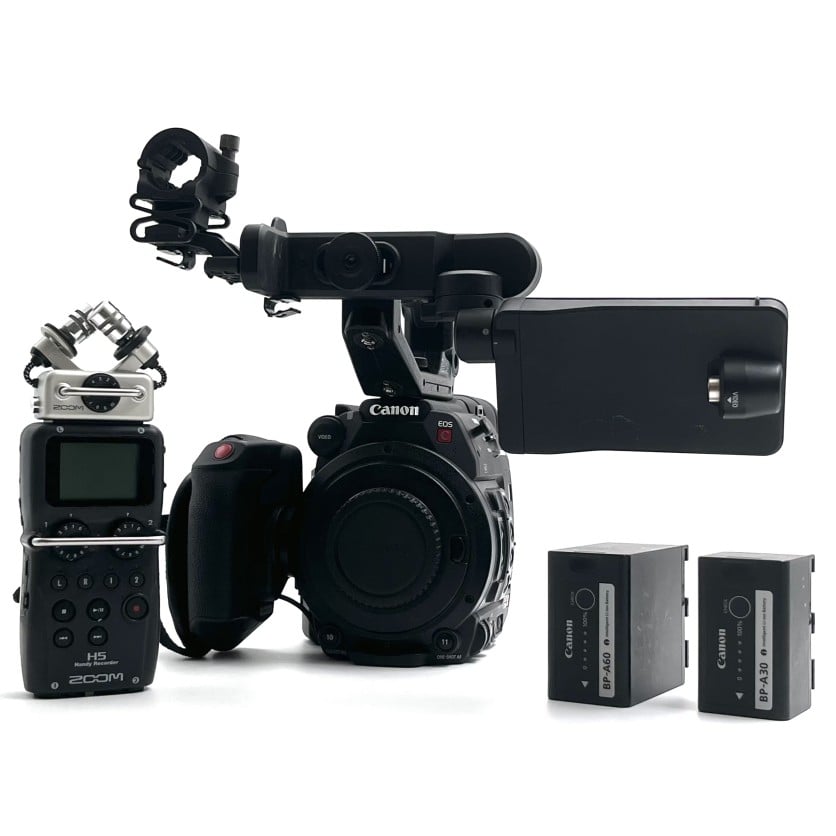 Includes: Canon BP-A30+Canon BPA60, CA-A10 AC Adapter, CG-A20 external charger, rubber eyecup, Zoom H5 recorder (4GB), Pelican iM2750 hard case (foam cut to fit items)