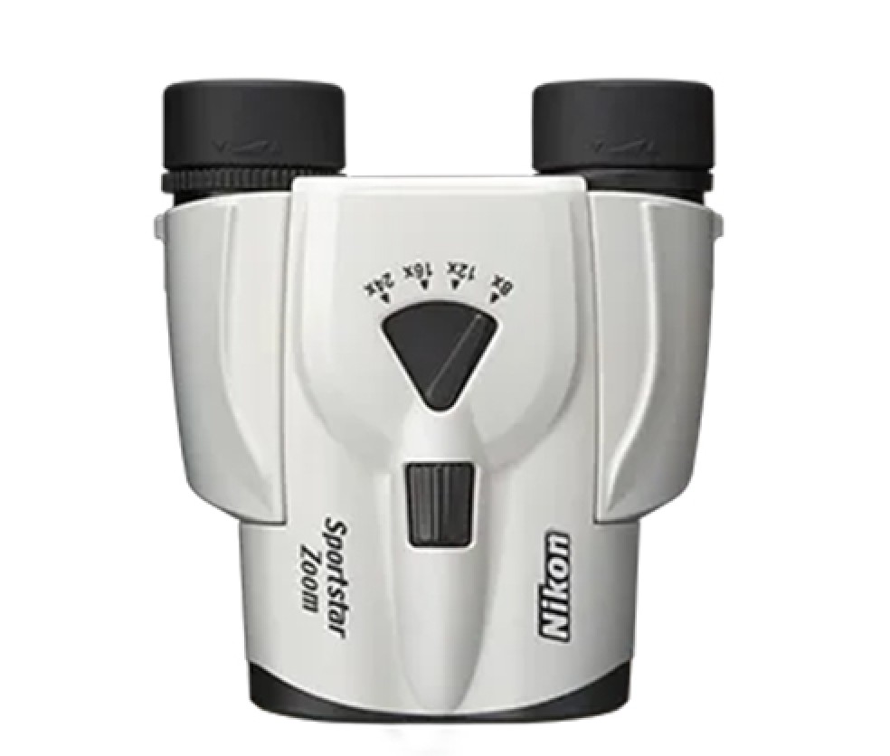 The white 8-24x25 Sportstar Zoom Binoculars from Nikon deliver versatility and portability that easily fits in a pack, pocket, or purse. The wide 3x magnification range is well suited for medium- to long-range viewing and ideal for sightseeing and glassing on the trail or in the woods. Nikon's proprietary zoom lever, located behind the center focus wheel, is ergonomically placed to be accessible with either hand for easier use. Twist-up eyecups help to ensure a comfortable viewing distance for almost any viewer—even if they wear eyeglasses.