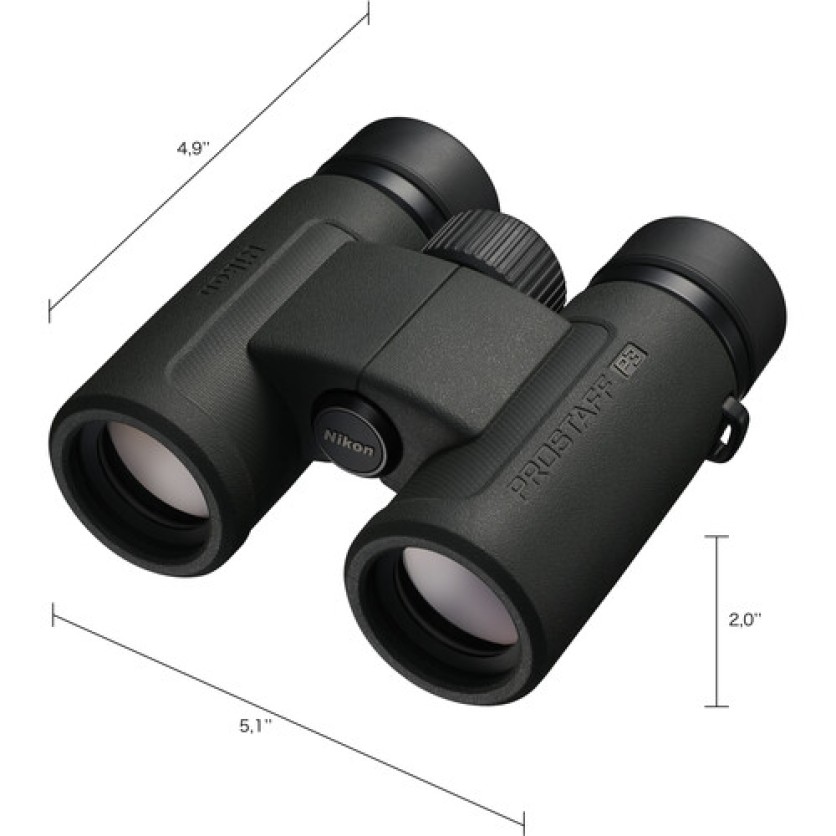 Small in size but packing the features and performance you expect from a Nikon optic, the PROSTAFF P3 8x30 Binoculars are a great companion for backpacking, birding, travel, and more. The 8x magnification shows you details at a distance but is easier to hold steady than more powerful binoculars. Multiple layers of antireflective coating and silver alloy on the prism mirrors deliver sharp views with vivid colors, and the 456' field of view takes in an expansive segment of the horizon. The PROSTAFF P3s are waterproof, fogproof, and drop-resistant, so you can carry them confidently on your outdoor adventures, and at less than 5" in length, they're easy to carry.