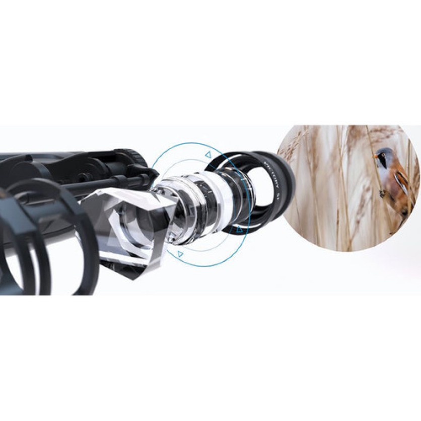 The optical precision starts with SCHOTT Ultra-FL extra-low dispersion (ED) fluoride (FL) lenses that virtually eliminate distortion and chromatic aberration while increasing contrast and color fidelity. Compact Schmidt-Pechan roof prisms are more compact than conventional prism designs and are coated with ZEISS' P* phase-correcting coatings to limit light loss and increase color fidelity and contrast. All of the optics are fully multi-coated with ZEISS' anti-reflection T* coatings. These greatly reduce light loss and maximize light transmission to create bright and clear images. The glass, prisms, and coatings all work together to create images that are clear and bright without distortion across the entire wide field of view, while colors are accurately represented with high contrast and crisp resolution.
