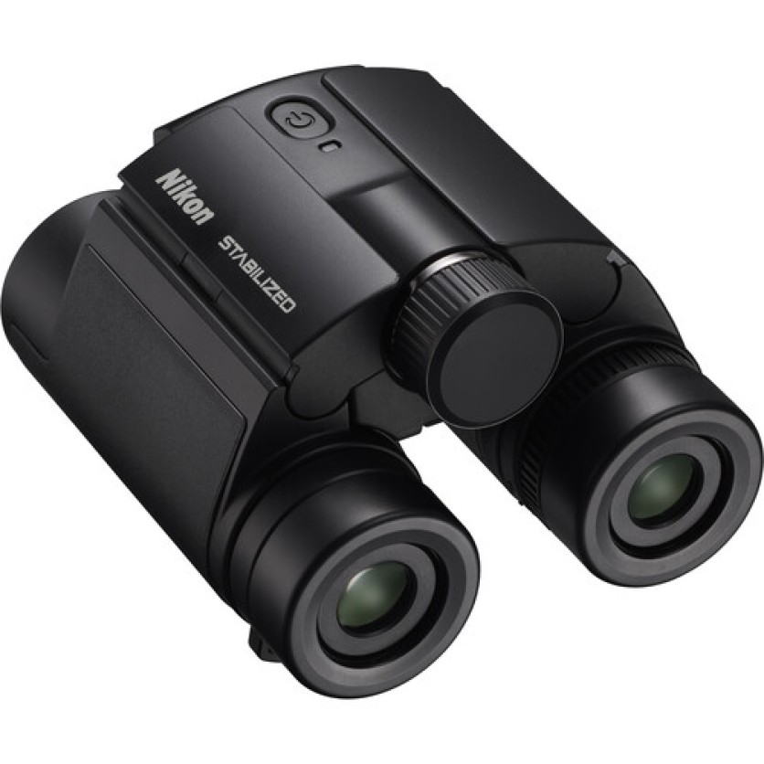 See the stage or the batter's box up close with zero image shake using these 12x25 S Stabilized Binoculars from Nikon. Binoculars this powerful often show a jittery view when handheld, but Nikon's electronic image stabilization system corrects this problem so you can enjoy your subject. The compact size makes them ideal for sporting events, music festivals, birding, hiking, or sightseeing. Antireflective coating on the lenses and silver alloy applied to the prisms ensure bright, high contrast views. Focus is easy with the large center wheel and the turn-and-slide eyecups accommodate both eyeglass wearers and non-wearers. The 12x25 S will run up to 12 hours on two AA batteries, with an auto-shutoff after 60 minutes of non-activity to preserve battery life.