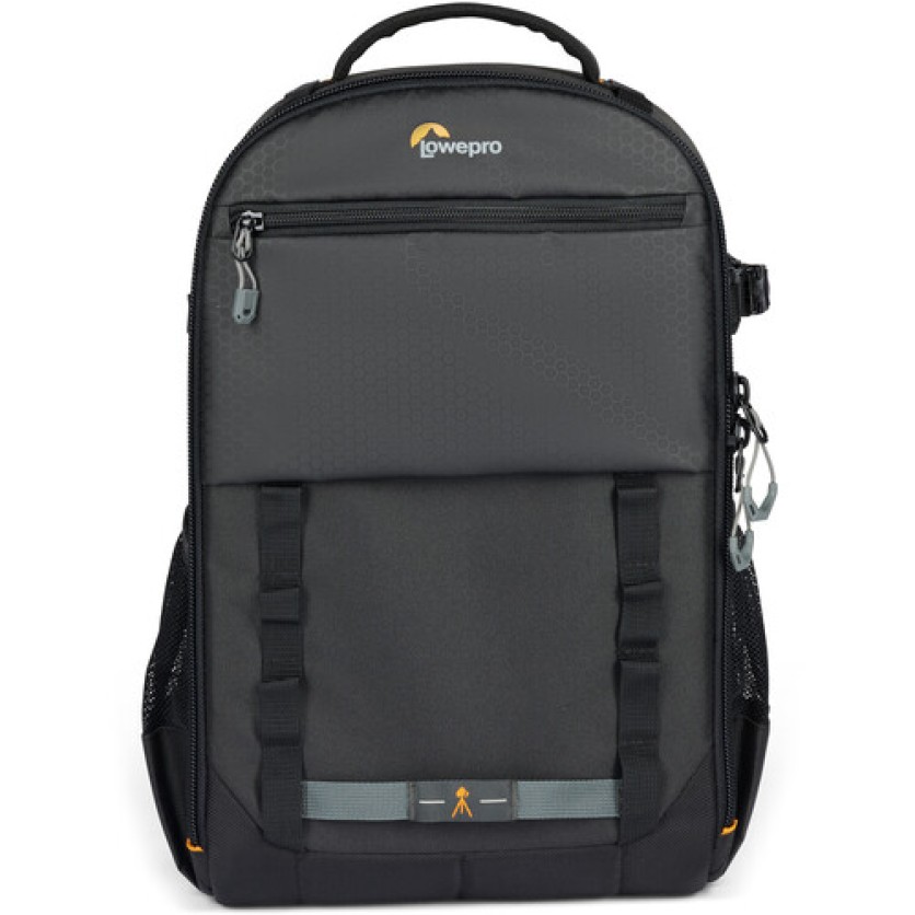The black Adventura BP 300 III Backpack from Lowepro is a classic photography pack useful for transporting, organizing, and protecting your entire kit. The Adventura BP 300 has plenty of room to organize a camera body with a full kit of lenses. It offers convenient front access and has a 13'' laptop pocket. The pack holds a full-frame mirrorless camera, including a Sony Alpha 7-9 series with a lens attached, plus four additional lenses, or a foldable drone like the DJI Mavic Pro 2. There is a pocket for a 13" laptop plus space for small accessories. The large side pocket accommodates a compact tripod, including a GorillaPod 5K or a Befree Advanced. The front of the pack has a tripod attachment that holds a larger tripod.