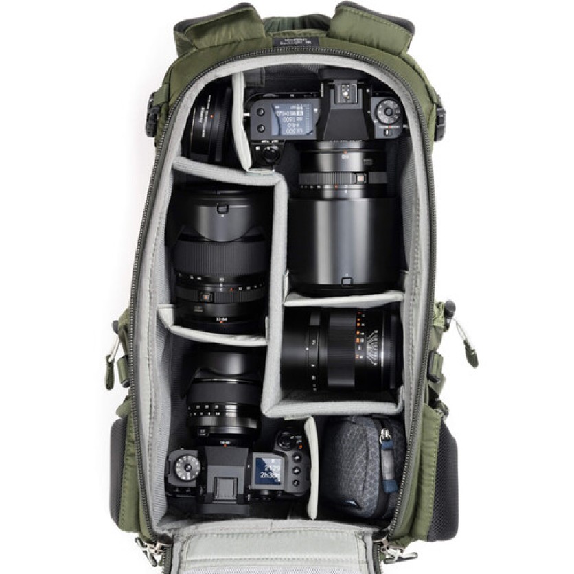 - Adjustable dividers for large telephoto lenses, traditional photo gear, or personal items