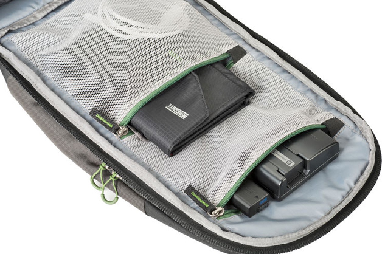 - Along the inside of the main compartment's zippered panel are two zippered, mesh organizer pockets which can be used to hold hard drives, portable batteries, camera filters, or small electronics