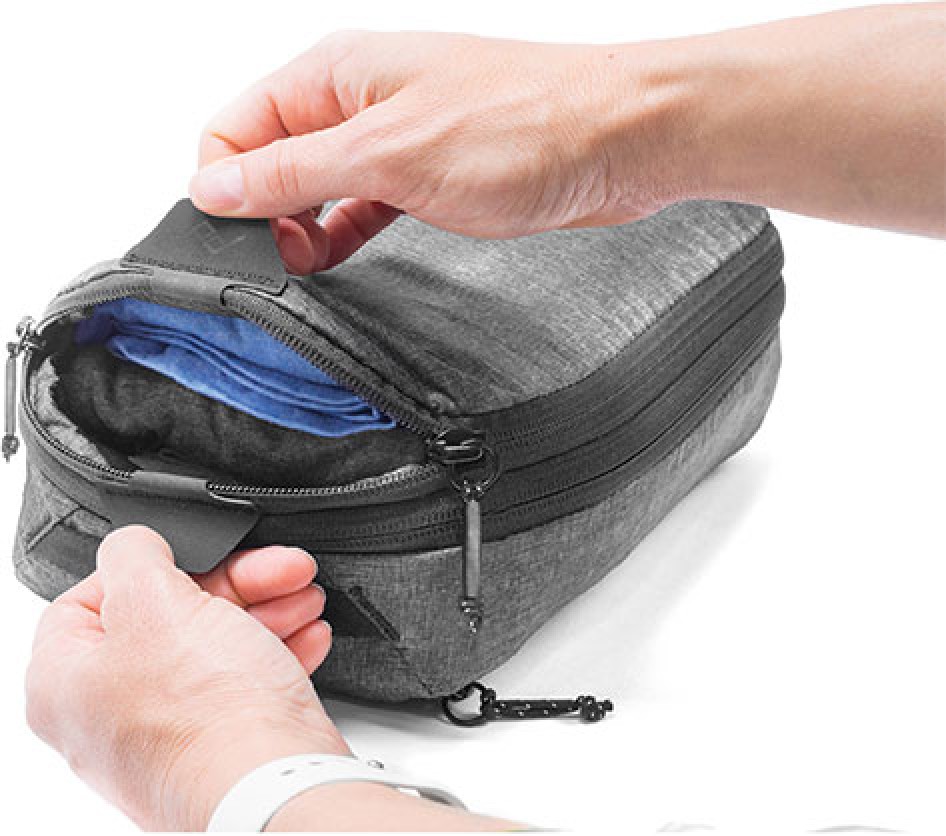 This small Travel Packing Cube from Peak Design is part of a compartment system that enhances the ability to organize the contents of a Peak Design Travel-series bag. Specifically designed to store clothing, it features a double-sided, clamshell configuration that is divided by an internal partition, allowing easy and space-efficient separation of clean and dirty clothes.