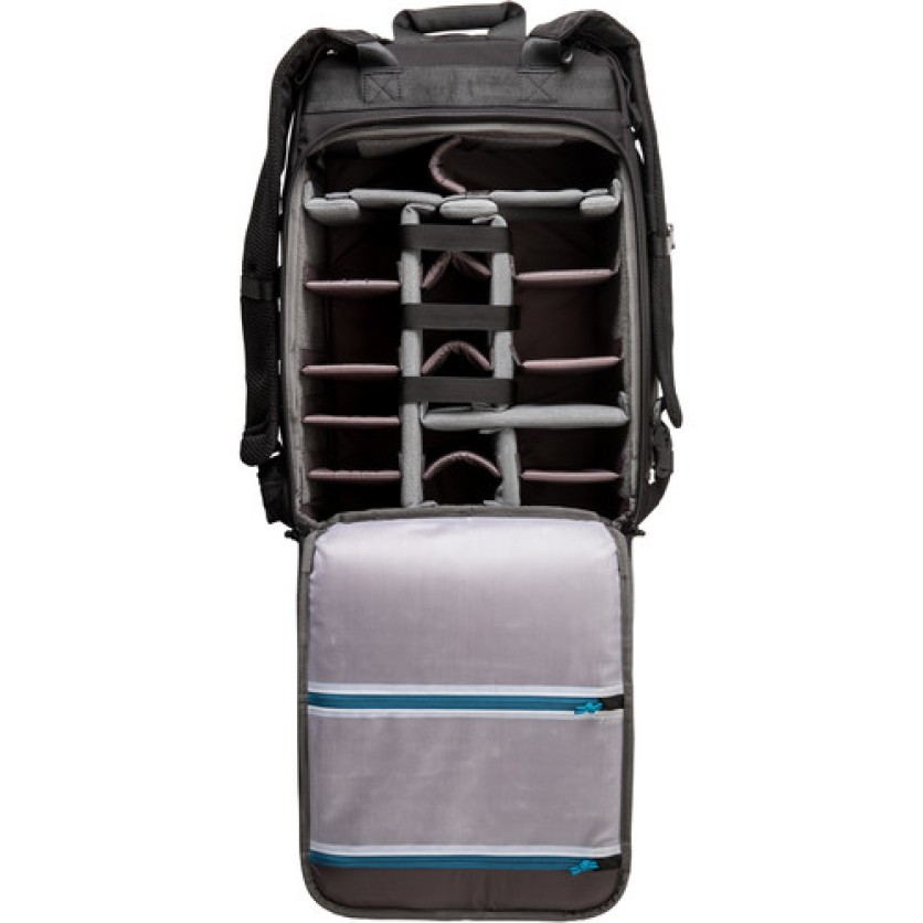 Comfortably carry two gripped DSLR or mirrorless cameras, up to eight lenses, and related accessories with the black Tenba Roadie 20 Backpack. The pack has rear access to camera gear, and front access to other items. There's also a separate compartment for a laptop up to 17". Inside the main compartment are padded touch-fastening dividers, and clear mesh accessory pockets. The exterior front zip compartment has a variety of pockets, and the side of the pack has a large pocket for accessories, or for securing a compact tripod.