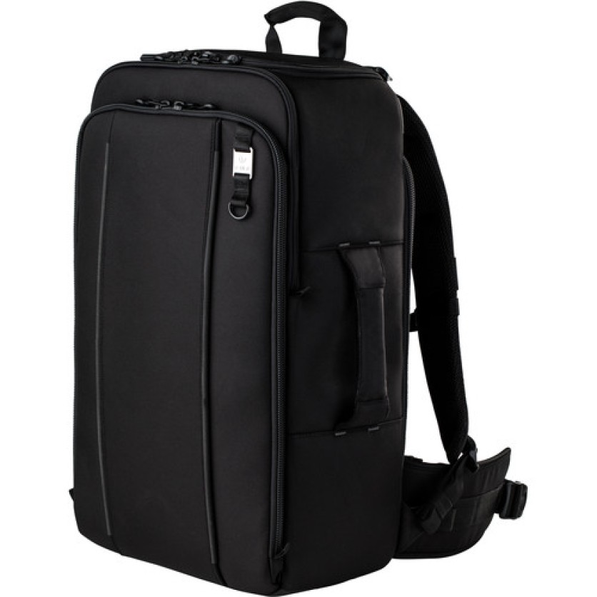 Comfortably carry two gripped DSLR or mirrorless cameras, up to eight lenses, and related accessories with the black Tenba Roadie 22 Backpack. The pack has rear access to camera gear, and front access to other items. There's also a separate compartment for a laptop up to 17". Inside the main compartment are padded touch-fastening dividers, and clear mesh accessory pockets. The exterior front zip compartment has a variety of pockets, and the side of the pack has a large pocket for accessories, or for securing a compact tripod.