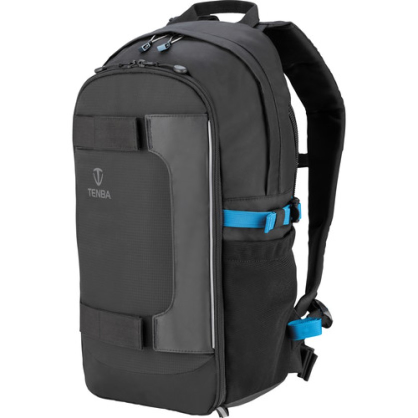 Protect and organize up to two GoPro cameras and accessories with the black Tenba Shootout ActionPack 12L. GoPro cameras and accessories can be stored in the protective pouches in the main rear compartment. The rear compartment has zippers on the front or rear of the bag so you can access your cameras and accessories without completely detaching the bag. The front compartment can hold an iPad or similar sized tablet and has pockets for additional accessories. The sides of the back have micro-mesh pockets that can fit other gear like monopods, water bottles, and gloves. Front straps can be used to hold skateboards, or to piggyback the bag on a rolling suitcase.