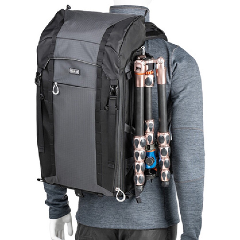 Included rain cover protects small to medium tripods secured to the front of the pack