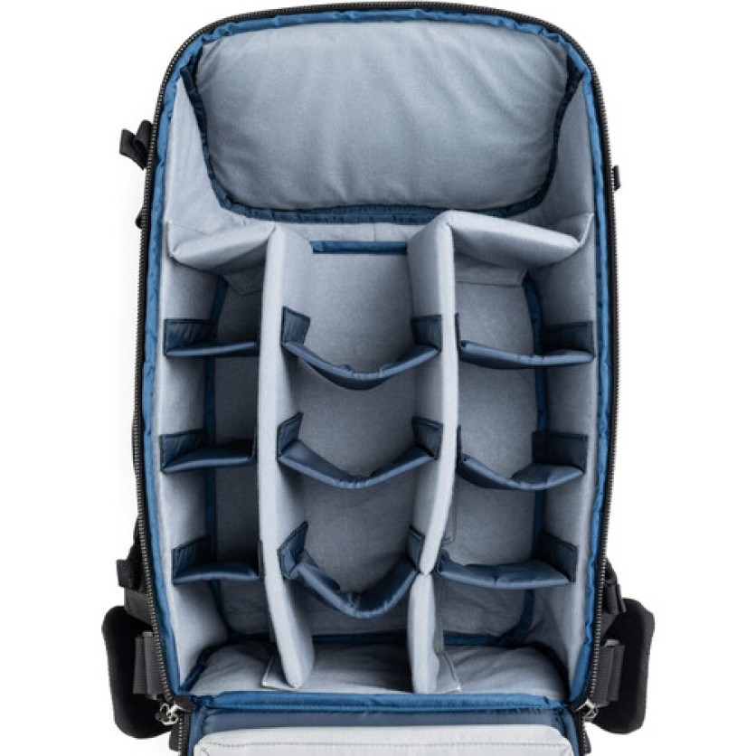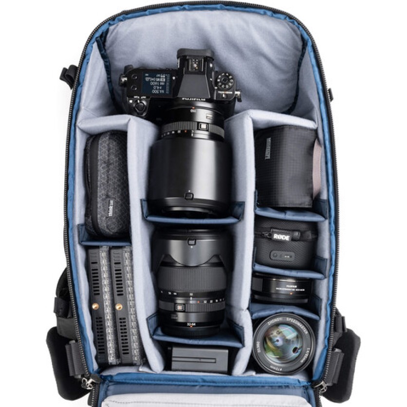 Adjustable dividers accommodate large telephoto lenses, traditional photo gear, or personal items