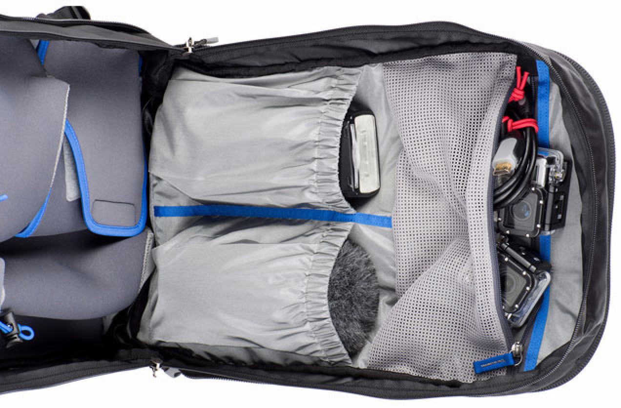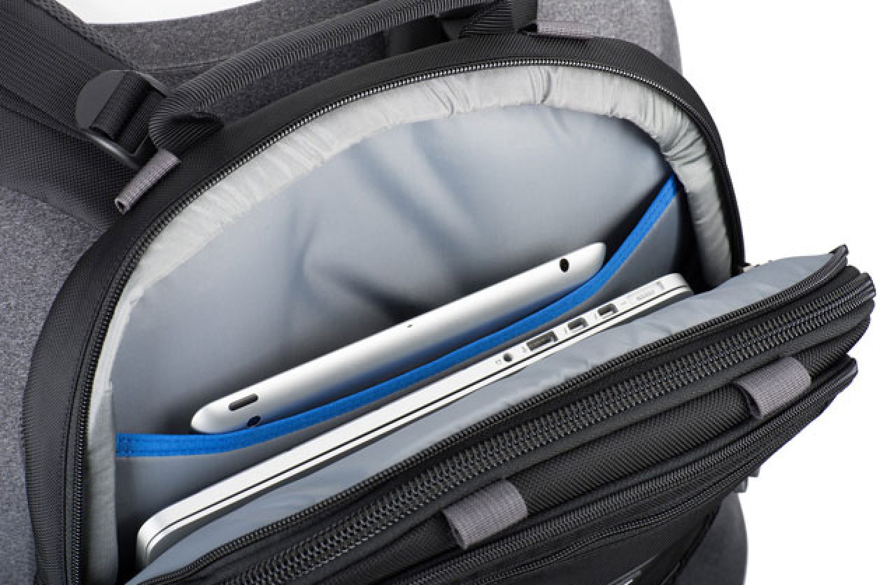 Holds a 17" laptop, an up to 13" tablet, one to two gripped or un-gripped DSLRs, three to four lenses (detached), related accessories, and personal items