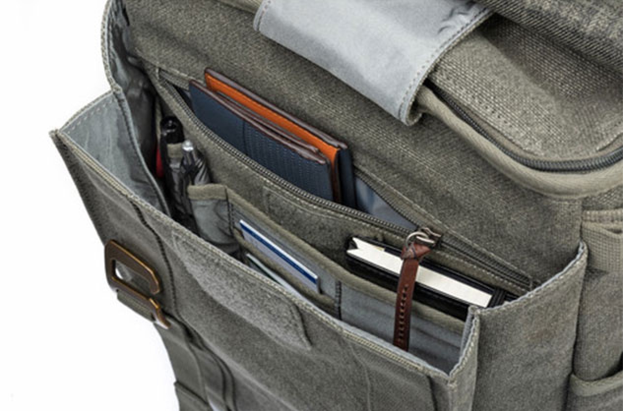The exterior of the bag is equipped with accessory straps that are compatible with Think Tank's modular pouches. Collapsible water bottle pockets on each side of the bag hold a water bottle or a tripod, or the tripod can attach to the front panel. The canvas of the bag has been treated to repel water, and a rain cover is included for those days when there is a heavy downpour. Both top and rear panels close via its YKK zippers.