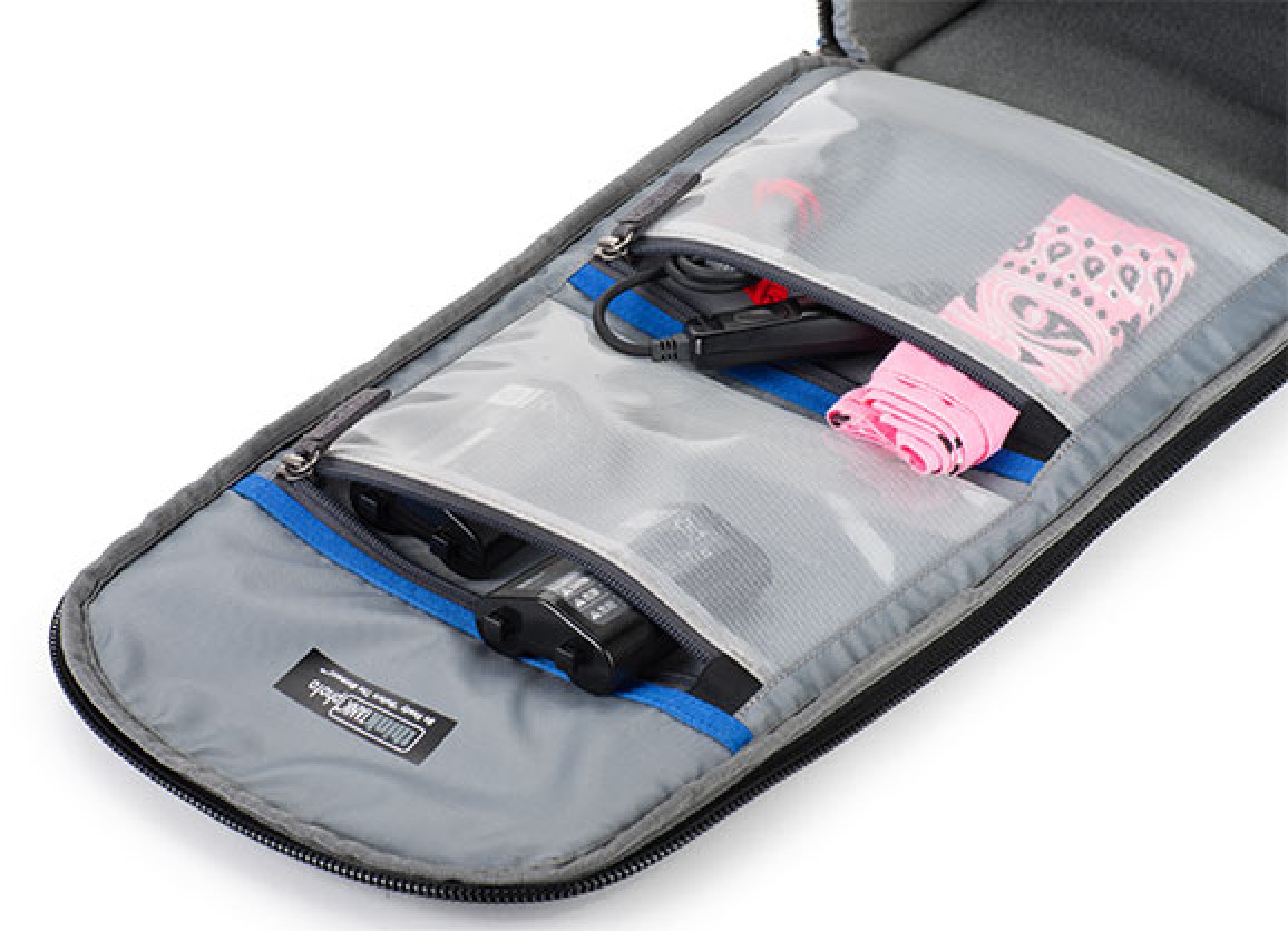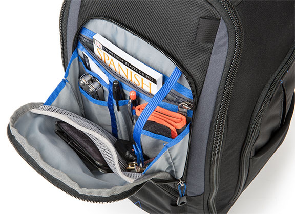 Also on the exterior front of the pack are two zippered front pockets. The upper one has an organizer panel for smaller items such as pens, batteries, memory cards, and a cell phone. Dual zippered pockets on either side of the pack have matching stretch pockets for storing a water bottle, gloves, or other gear. On top of the pack is an ID card holder and a padded grip handle. For added security, the YKK zipper pulls can accept a user-supplied, optional padlock.