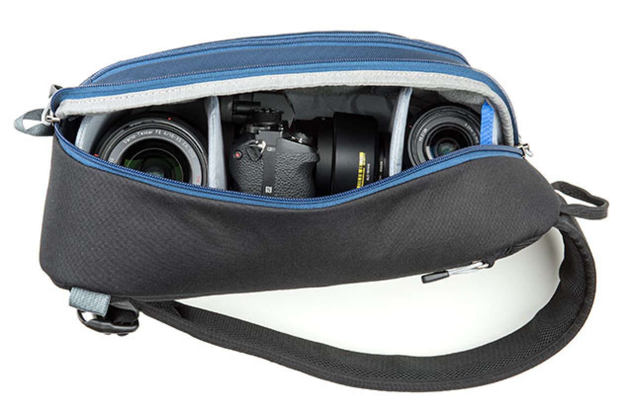 The lightweight blue indigo TurnStyle 10V2.0 Sling Camera Bag from Think Tank Photo is water-resistant and holds a DSLR with three lenses and accessories inside interior dividers within the main zippered camera compartment. It also accommodates a small 8" tablet in a dedicated padded zippered exterior pocket at the back of the bag. For holding accessories, there are assorted pockets throughout the sling.