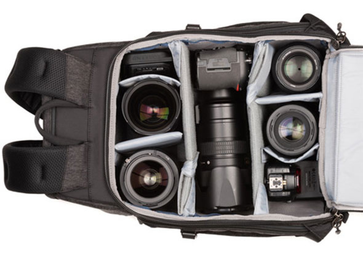 - Spacious main compartment with seven, touch tab dividers can be configured to hold a DSLR or mirrorless camera with an attached 70-200mm f/2.8 lens, six to seven additional lenses, and a shoe mount flash
