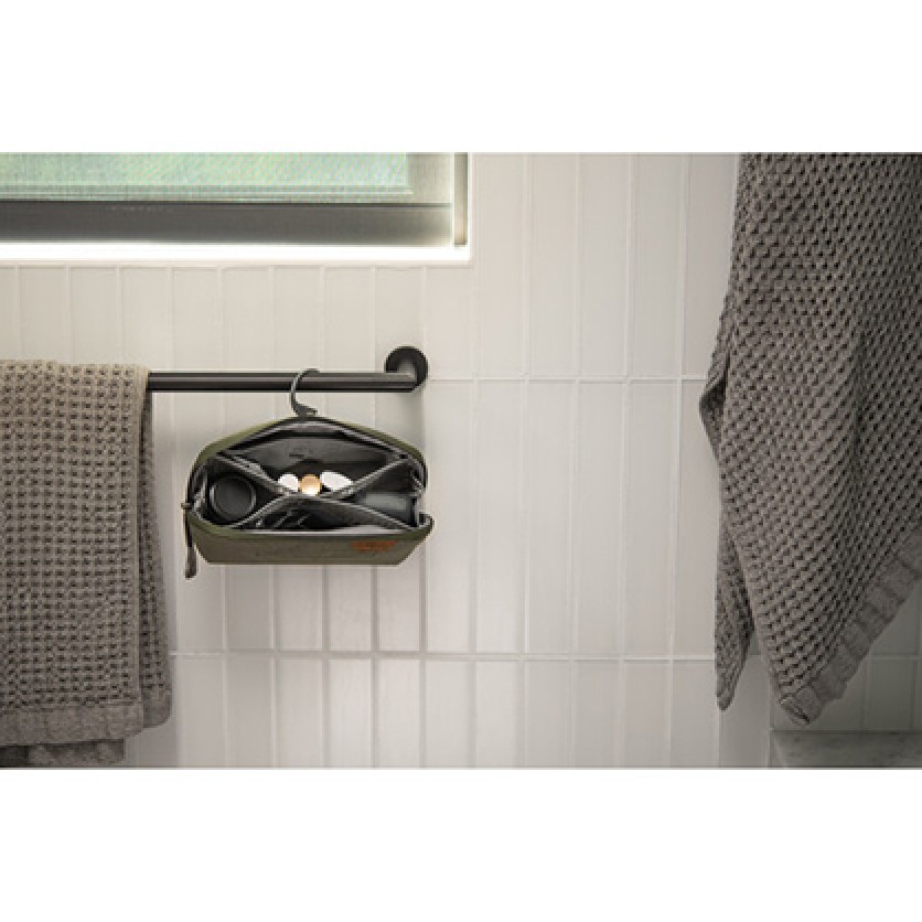 The Peak Design Wash Pouch in sage is a simple yet functional toiletry bag. This pouch can sit upright on the counter or conveniently hang via its stowable hook, always giving visibility and easy access to your toiletries. The pouch is small and compact but can accommodate a variety of differently sized and shaped toiletries.