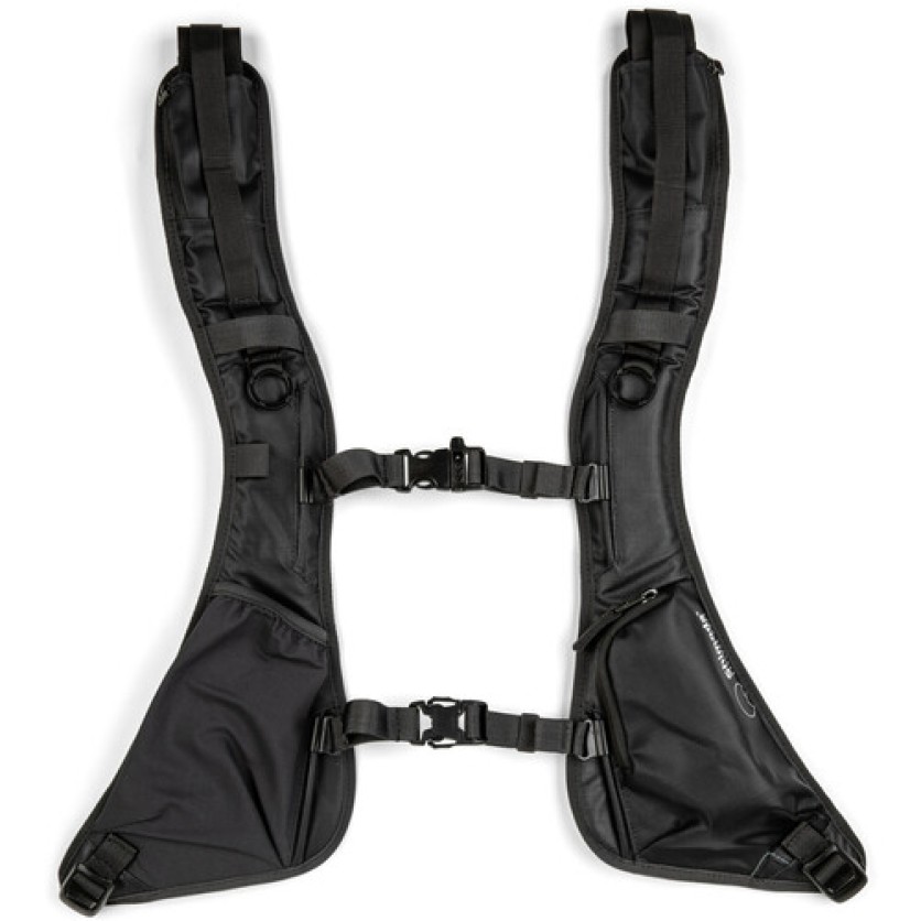 These black backpack straps are designed for a secure, comfortable fit for women with wider backs or chests and medium to large torsos. They replace the original straps on specific Shimoda backpacks and feature twin sternum straps to avoid chest pressure. A left shoulder pocket holds a smartphone, and a right pocket accommodates essentials like sunscreen or snacks. Gear loops allow for easy accessory attachment, enhancing convenience and functionality.