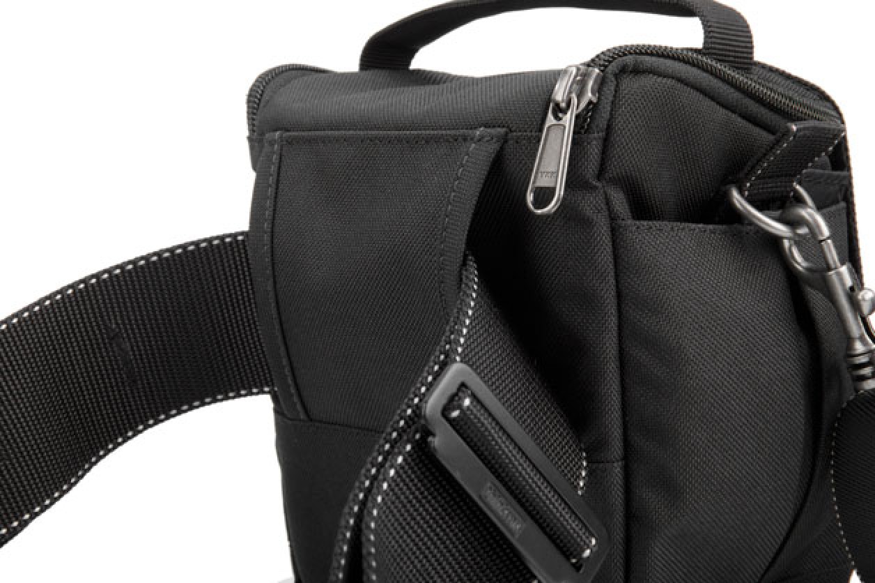 The bag can be carried by the top handle, worn over your shoulder with an adjustable strap, or worn on a pant belt using the rear pass-through slot. Stretchable side pockets and an interior mesh pocket can hold accessories such as memory cards, batteries, or the included seam-sealed rain cover.