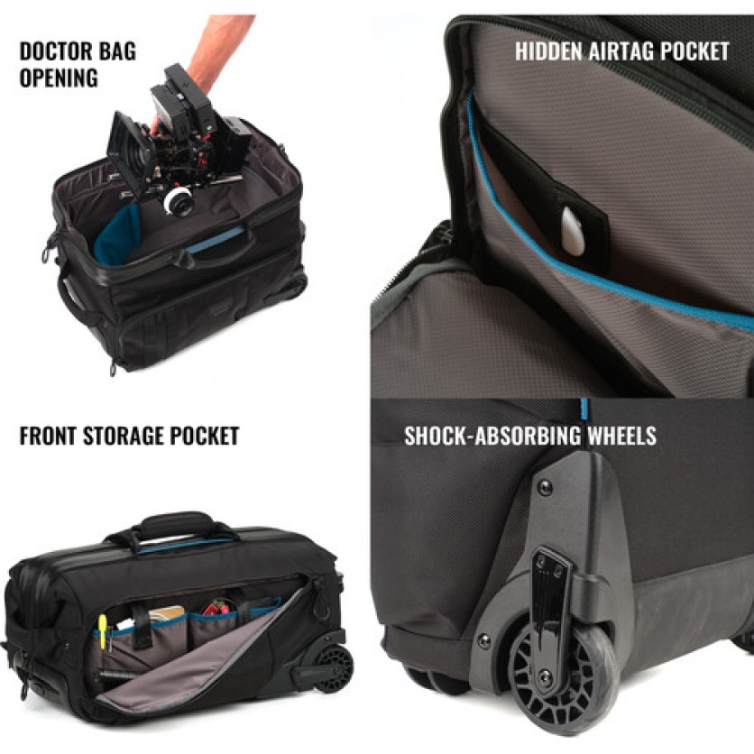 The 28L Cineluxe V2 Roller 21 in black from Tenba accommodates compact mirrorless, DSLR, or cinema cameras up to 18" long, plus assembled accessories. The bag has built-in wheels and a retractable handle for easy transport to set. It features a doctor bag-style opening down the middle for easy access to stored gear and maintaining the bag's footprint when opened.