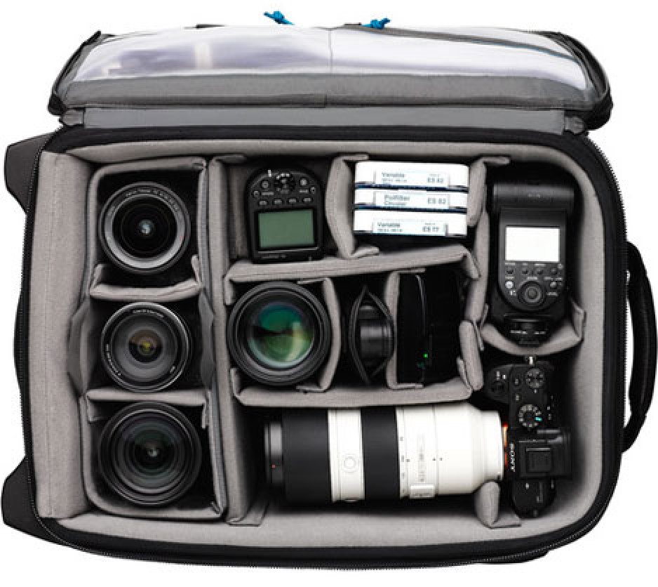 A large, main compartment with adjustable dividers can hold a complete kit for many photographers, while the interior of the main compartment lid features four, clear mesh panels for easy identification of their contents. The Roadie Hybrid Roller 21 can fit two, gripped DSLR camera bodies with a 400mm f/2.8 lens or eight to ten smaller lenses, along with flashes and accessories.