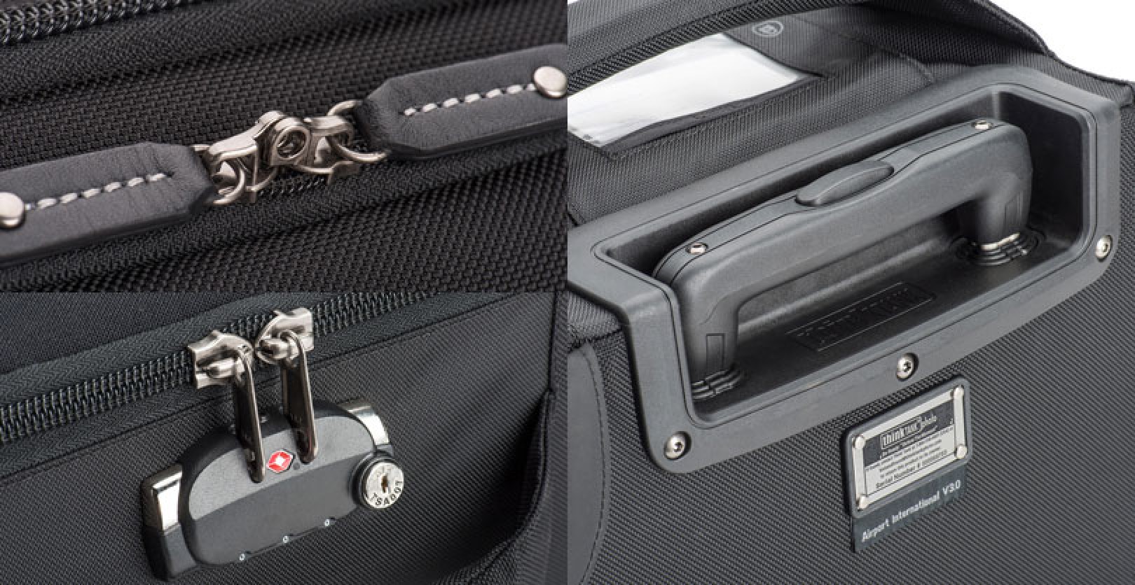 Conveniently travel with your cameras and camera equipment with the Think Tank Photo Airport International V3.0 Rolling Camera Bag - Black. Its smartly designed interior makes it comfortable to store and carry your gear on small aircraft. This bag has a pocket with a padded sleeve, specially designed for 15-inch laptops. The lockable zipper sliders come in handy for securing expensive gear, while the interior zippered pockets contain ample space for placing batteries, filters, memory cards, and other accessories. The custom-designed 80-mm wheels, with sealed ABEC grade-5 bearings, ensure smooth and quiet movements of the bag. Additional features of this bag include a seam-sealed rain cover, as well as a water-bottle pocket and a tripod mount on the side portion.