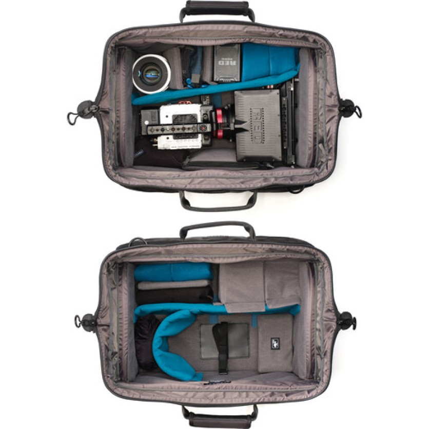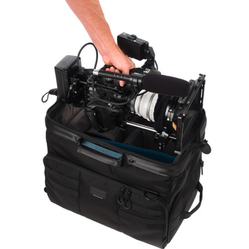 The 42L Cineluxe V2 Shoulder Bag 21 Hightop in black from Tenba accommodates mirrorless, DSLR, or cinema camera rigs up to 18" long, plus attached accessories. The 12" interior height of the 21 Hightop allows you to carry your camera rig with baseplate, matte box, monitor, and mic attached, so you're ready to shoot when you arrive at your destination. It features a doctor bag-style opening down the middle for easy access to stored gear and maintaining the bag's footprint when opened.
