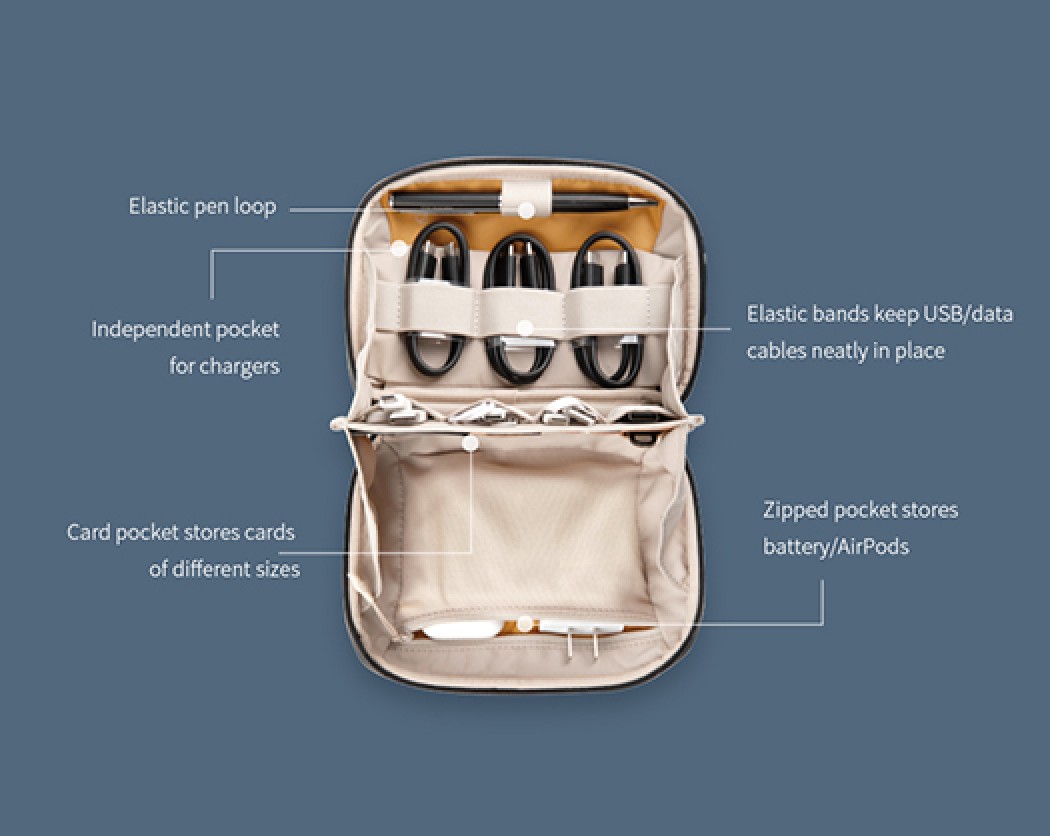 The twilight black Mini Tech POUCH from PGYTECH holds and organizes your small accessories. It features a clamshell-style opening so you can use it half closed or fully open. Multiple interior pockets and elastic accessory loops hold your chargers, cables, earphones, power banks, pens, batteries, and more. The exterior is water repellent, so it's great for travel. A hidden AirTag pocket provides peace of mind during your commute.