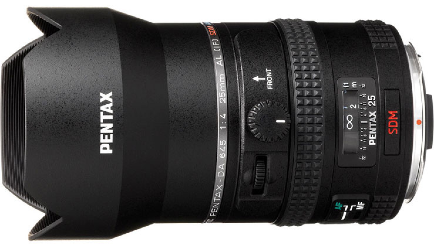 The Pentax smc DA 645 25mm f/4 AL (IF) SDM AW Lens is a wide angle lens for use with the Pentax 645D digital camera. Its 25mm focal length is equivalent to 19.5mm in 35mm format and provides you with an angle of view of 95°. The combination of such a wide angle focal length and a minimum focus distance of 1.31' / 0.4m gives this lens a tremendous hyperfocal distance, ideal for landscape photography and other broad scenes.