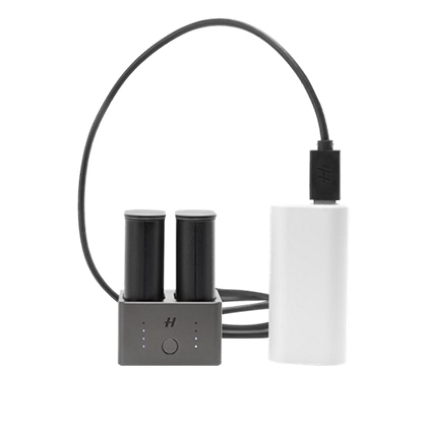 Streamlining the battery charging process, the Hasselblad Battery Charging Hub for the X1D-50c contains dual slots that support the simultaneous charging of two batteries. An integrated USB Type-C connector supports mains power via an included power supply or from common external USB battery banks (sold separately). Front-facing LEDs indicate status and capacity when charging, or users can use the Battery Charging Hub to check battery levels simply by inserting a battery and pressing a single button.