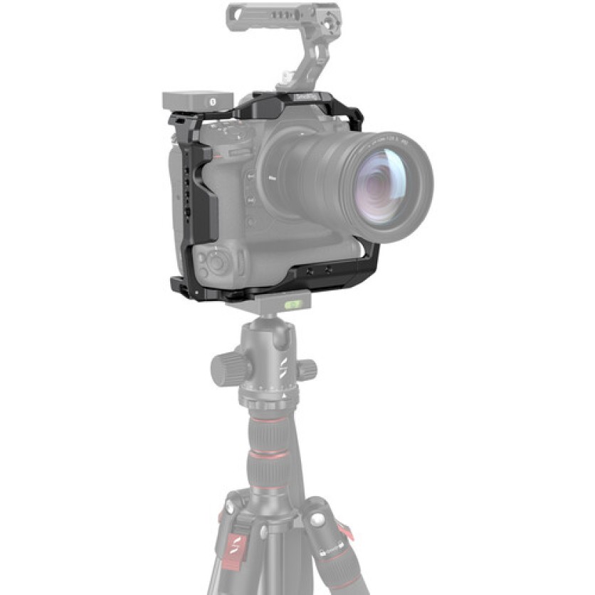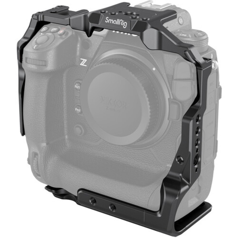 This lightweight aluminum Camera Cage from SmallRig protects and provides accessory mounting for your Nikon Z9 camera. This formfitting cage maintains access to the camera's controls, battery, and SD card slot, and it features a variety of mounting options. The camera secures into the cage using three screw points to prevent twisting, and rubber padding on the base protects and further secures the camera.