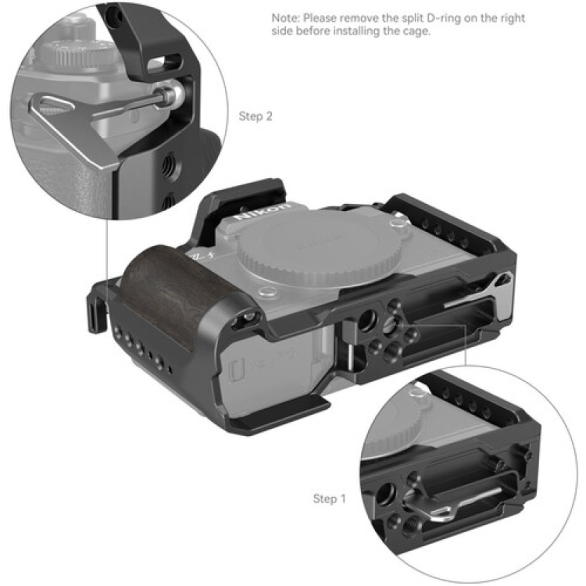 This lightweight aluminum Camera Cage from SmallRig protects and provides accessory mounting for your Nikon Zf camera. This formfitting cage maintains access to all the camera's controls, battery, and SD card slots, and it features a variety of mounting options. The camera secures onto the cage using a 1/4"-20 camera screw, and a side M2.5 screw further prevents twisting.