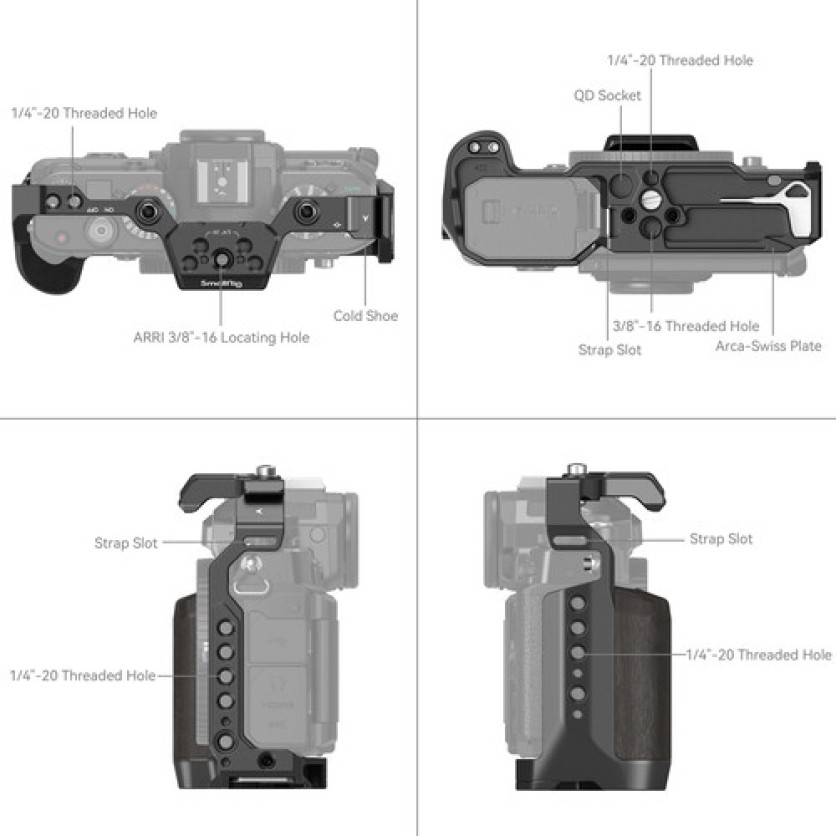 In addition to one shoe mount and multiple 1/4"-20 and 3/8"-16 accessory threads, the cage incorporates ARRI-style locating holes to prevent accessories from twisting when mounted. There is also a QD (Quick Detach) mount and strap slots for even more options. The cage also has an integrated Arca-type quick release plate on the bottom for tripod mounting.