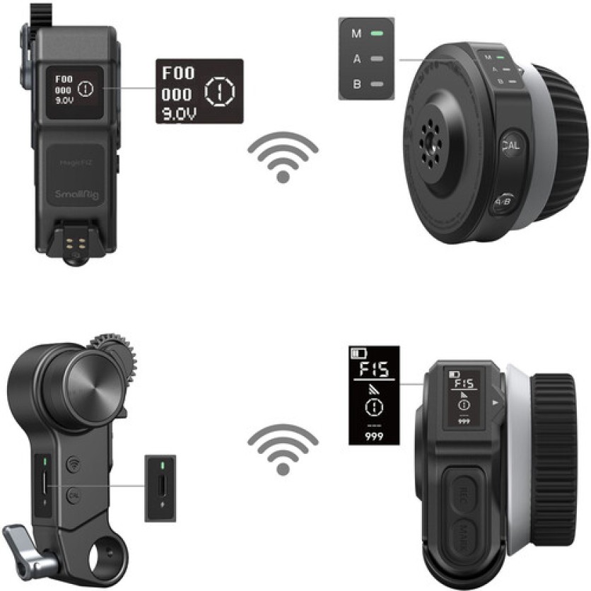 Create a low-latency focus-pulling experience with this Wireless Follow Focus Lite Kit from SmallRig. The kit includes a wireless handwheel controller and receiver motor for precise and intuitive control over your lenses. Green and blue light indicators on the OLED display indicate connection status and channels. Memory storage embedded in the system eliminates the need to recalibrate lens travel and AB point settings for increased efficiency. A 0.4 Nm torque output allows for effortless control over zoom lenses. USB-C ports on the handwheel and the motor power the devices and allow PD and QC fast charging protocols. A built-in 1400mAh battery on the handwheel can run the system for up to 21 hours. The system secures onto your camera using the quick release follow focus ring, 15mm rod clamp with NATO rail, and 15mm rod.