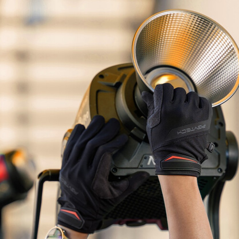 These full-finger, black Heat-Resistant Photography Gloves in size extra large from PGYTECH are designed for lighting technicians working in complex environments. The palm and thumb joint have a microfiber exterior for grip and durability, while the interior is reinforced with a layer of Y-WARM heat-insulating material to shield hands from the high temperatures generated by lighting equipment. The backside of the glove is made of a breathable mesh to keep the hand dry and comfortable during prolonged periods of use. The gloves are secured at the wrist with a PVC cinch strap and an anti-loss buckle allows the pair to be clipped together when not in use to prevent misplacement.