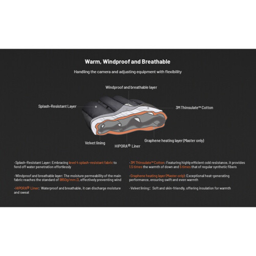 The black, x-large Master Photography Gloves from PGYTECH keep your hands warm while shooting in freezing temperatures. In addition to being warm, windproof, and splash resistant, these gloves feature a Graphene heating layer and a 4000mAh TYPE-C interface for extended heating capabilities. They have a cushioned leather palm for enhanced comfort and a nonslip grip.