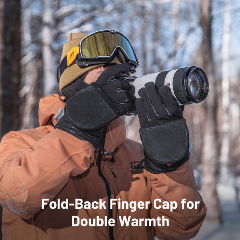These large, black professional photography gloves are designed to keep your hands warm and dry in harsh conditions. They feature 3M Thinsulate cotton, providing superior cold resistance, and a HIPORA liner for waterproof breathability. Windproof and splash-resistant, they offer a nonslip grip with genuine leather palms and SBR cushioning. Velvet lining ensures comfort, while flip-back fingertips and touchscreen-compatible microfiber enhance dexterity and control.