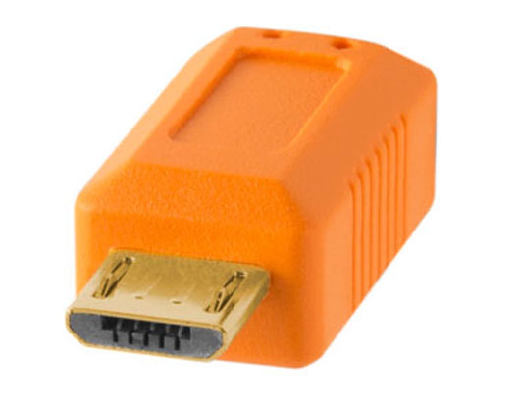The TetherPro cable connects to a camera using a Micro-B 5 Pin port. This cable is designed and manufactured to the highest USB specifications ensuring delivery of excellent performance in speed and reliability.