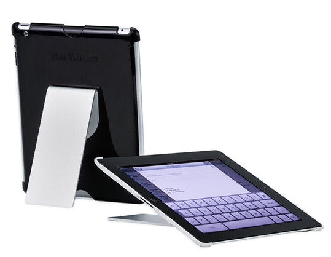 It’s a compact kickstand for the iPad. The Studio Proper Wallee Kick is created in sleek brushed aluminum and can be used as an upright stand for the perfect display viewing experience or, with a simple twist, it transforms into a low profile kickstand providing ideal typing comfort.