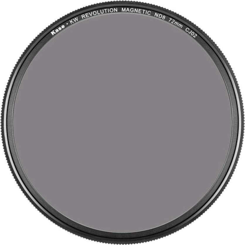 The 72mm Kase KW Revolution Entry Kit features ND8, ND64, and CPL magnetic filters, part of Kase's color-coded KW Revolution filter system. The filters are designed with color-coded filter frames for easy identification and swapping. The ND8 is color-coded blue, the ND64 is yellow, and the CPL is silver. The kit also includes adapter rings, a filter case, and one front lens cap. The KW Revolution system is based on Kase's earlier Wolverine series and is fully backwards-compatible with Wolverine filters.