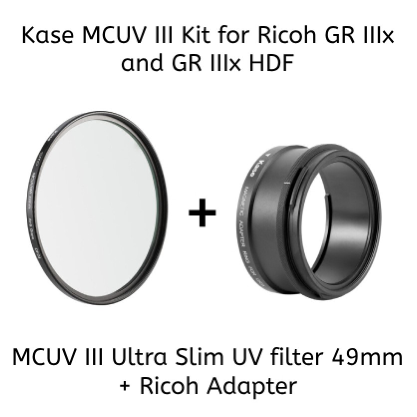 Kase MCUV III Kit for Ricoh GR IIIx and GR IIIx HDF is a kit including a perfectly crafted adapter ring for Ricoh GR IIIx camera, and the Kase signature MCUV III Ultra Slim UV filter 49mm.