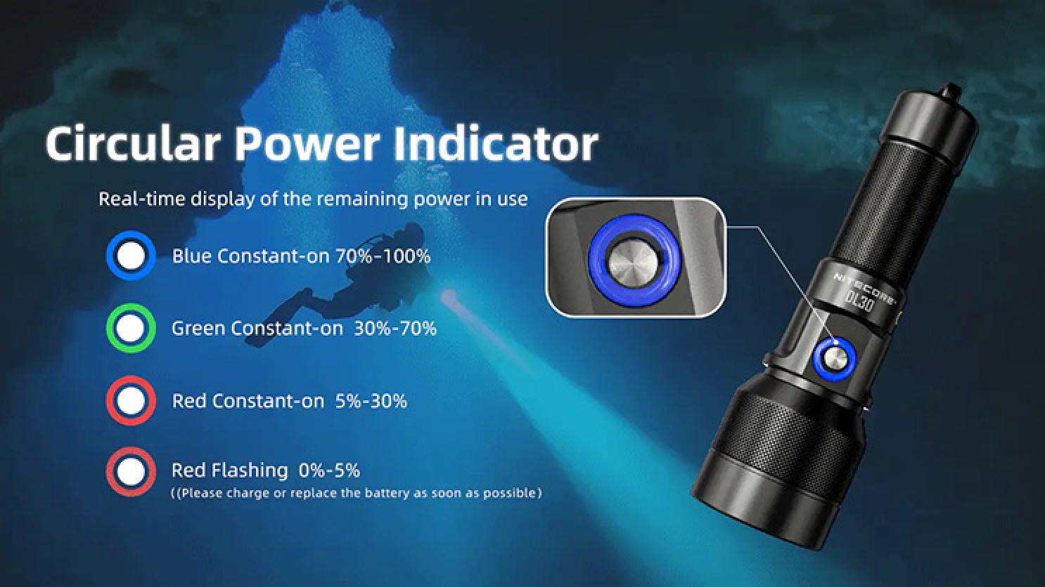 The DL30 can be charged via its USB-C rechargeable battery that can provide a runtime of up to 6 hours. A circular power indicator is located around the DL30’s power button that will change colors depending on its remaining battery life. Built for rugged underwater use, the DL30 features thickened tempered glass and a hard-anodized finish, giving it an IP68 waterproof rating and impact resistance of up to 1 meter. The included wrist lanyard ensures secure handling during dives, making it an indispensable companion for any diver.