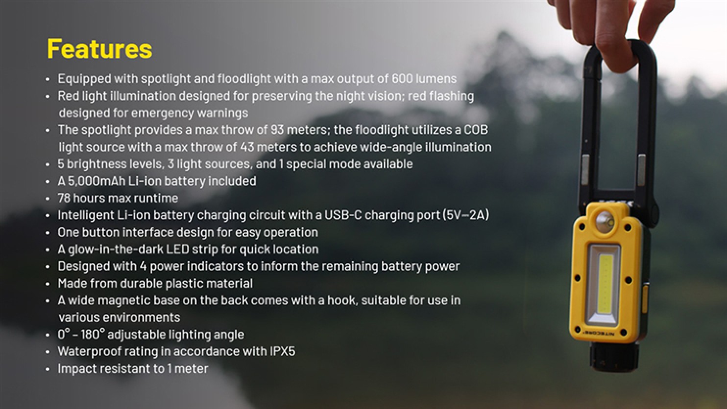 NWL20 is USB-C rechargeable with a long-lasting runtime of up to 78 hours. You can even charge it while in use which extends its runtime further. Power indicators keep you informed about when it's time to recharge. Engineered to endure various activities, the NWL20 can withstand impacts of up to 1 meter and boasts an IPX5 rating, safeguarding it against splashes of water and rain. Whether you're using it outdoors, for emergency lighting, or at a worksite, the NWL20 is a valuable addition to any worksite or outdoor adventure.