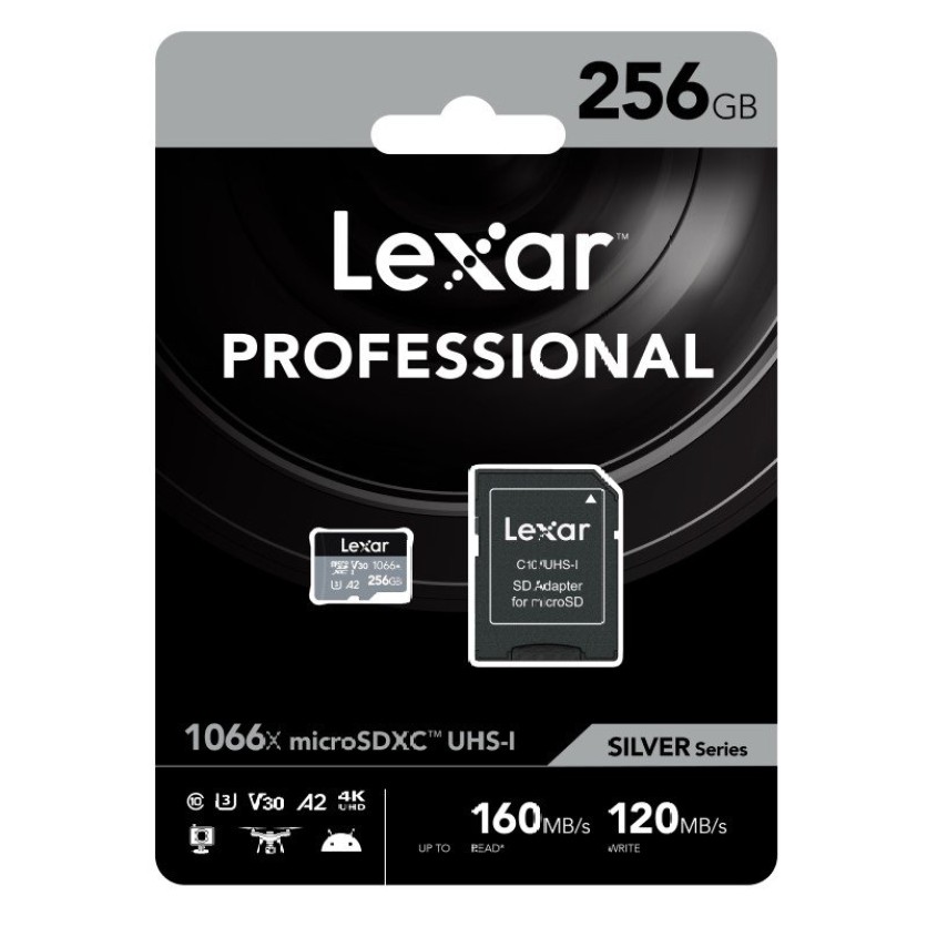 Designed for your action cameras, drones, or Android™ smartphone, the Lexar® Professional 1066x microSD™ UHS-I Card SILVER Series lets you quickly capture and transfer high-quality photos, including Full-HD and 4K UHD video with speeds up to 160MB/s read, and up to 120MB/s write. The card is U3, V30 and A23,4 rated for high-speed performance. This card gives you the speed and storage you need to capture more adventures on the go.