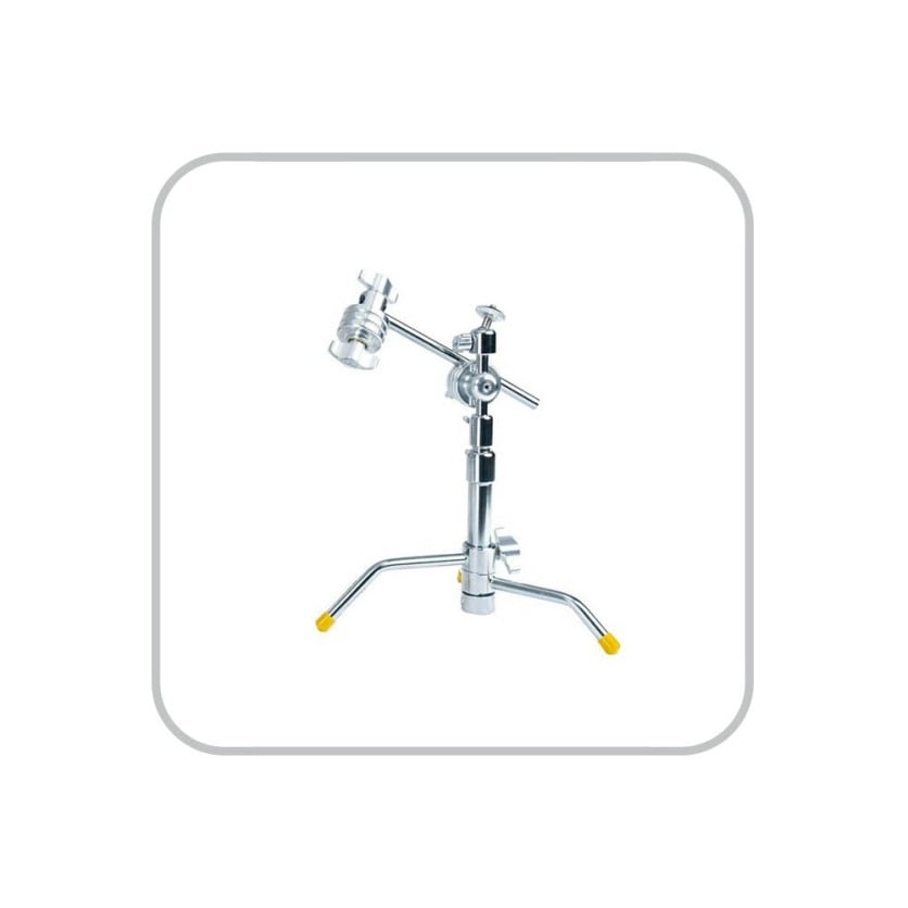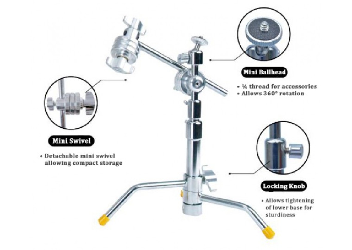 This mini c-stand is a versatile and portable lighting and grip stand designed for video and photography enthusiasts. It is made of lightweight aluminum, making it easy to carry and set up. The stand features three different grip designs that can hold various accessories such as pocket-sized LED lights, microphones, and monitors.