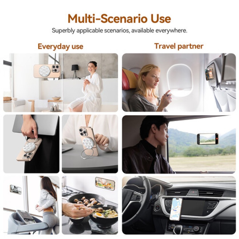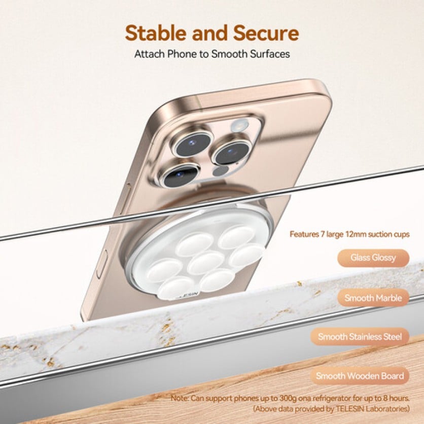 This suction cup mount offers MagSafe iPhone users a secure and versatile phone accessory. It attaches easily to smooth surfaces like glass and marble, and its integrated mirror is handy for makeup touch-ups or selfies. Lightweight and portable, it fits into most pockets or purses. The hinged ring handle functions as a gimbal or a prop for filming. An adhesive magnet ring is provided for non-magnetic phones, ensuring compatibility with a range of devices.