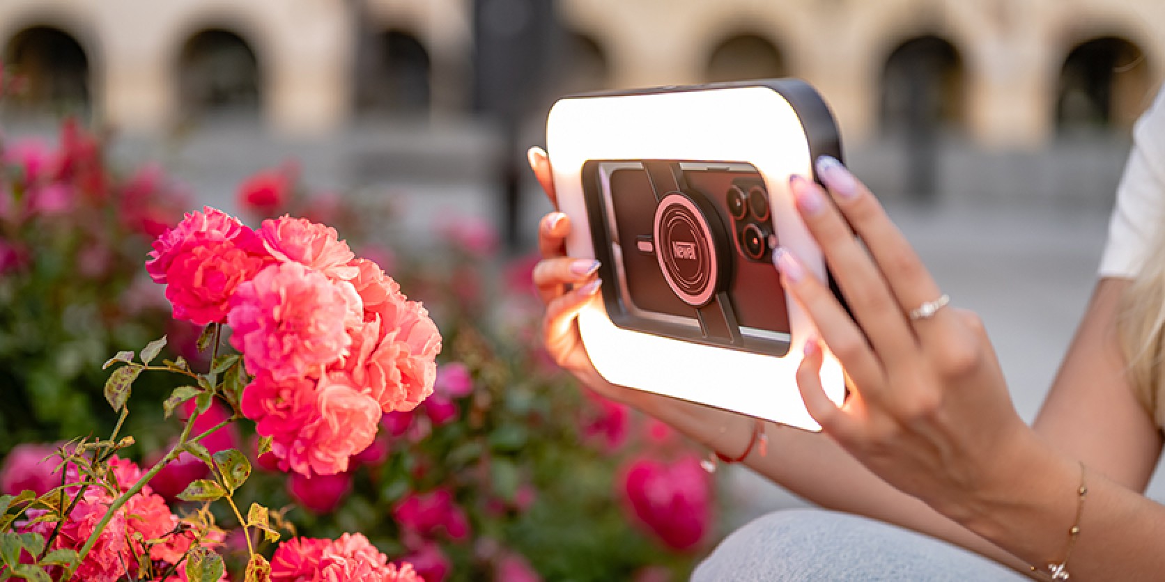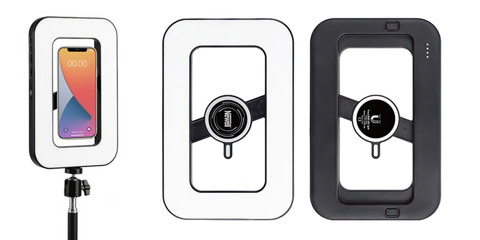 Newell Freya is a state-of-the-art LED light with a magnetic smartphone mount, combining light, grip and cinematographer’s cage function in one compact design. With MagSafe technology (or the included ring), you will stably install your phone in the center of the frame. Four LED panels provide even illumination for your frames. You can turn off selected segments as needed. Adjustable color temperature (2500-6500 K), full RGB color spectrum (0-359°), CRI 95+ and built-in 3000 mAh battery give you full working freedom. Comes with a ministat and three 1/4" threads for mounting additional accessories. Ideal for vlogging, broadcasting, shooting and creative shots – in the studio and in the field. Product covered by Newell’s 40-month support program.