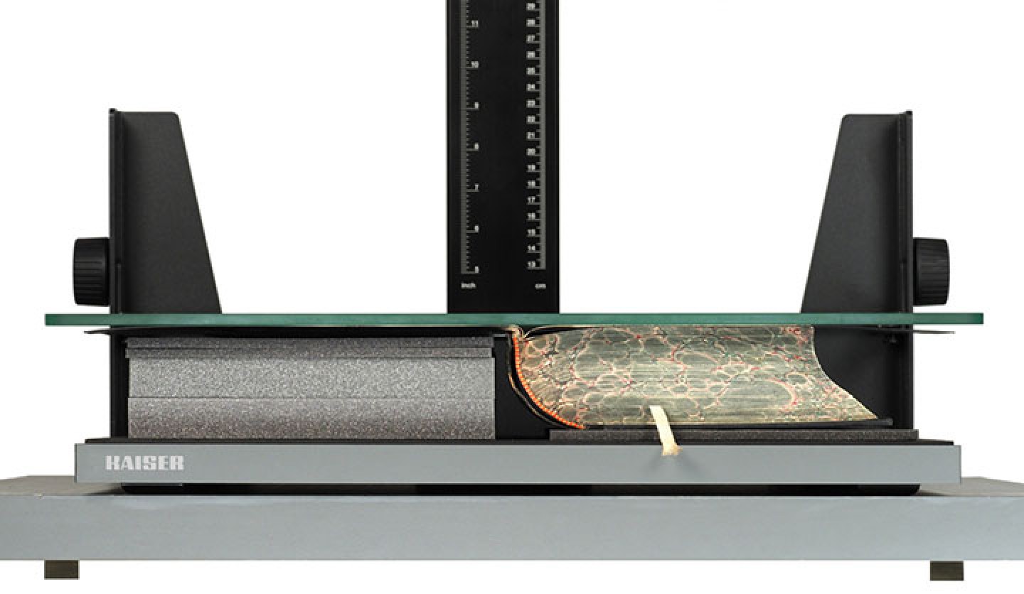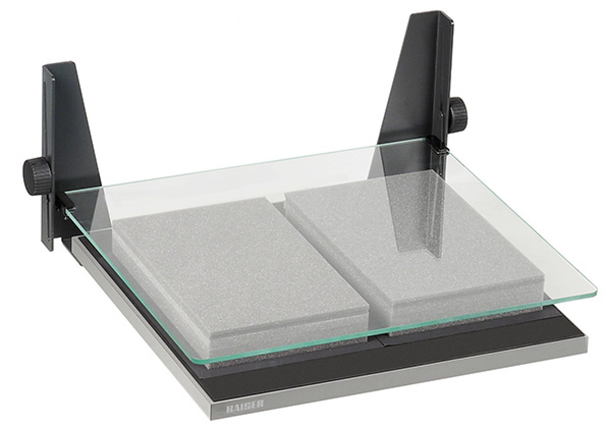 Solid base plate with non-slip coating on top and non-slip feet underneath. 6 mm (0.2 in.) thick glass pressure plate, foldable and variable in height. To work more ergonomically, more efficiently and original-friendly at a particular height, you can lock the glass pressure plate into a position between 0 and 145 mm (5.7 in.).