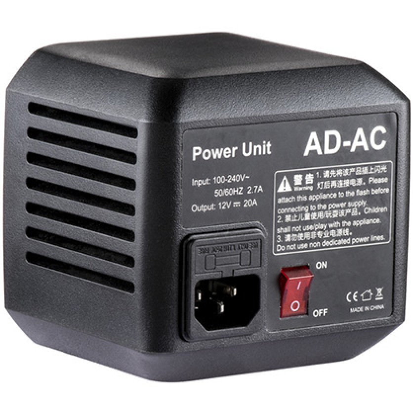This adapter allows the Godox AD600 monolight to be powered via AC, eliminating the need for battery changes and ensuring continuous shooting. It's versatile with a wide input range of 100-240 VAC, making it suitable for use in various locations worldwide.