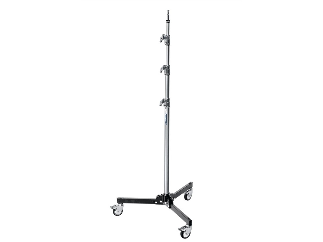 This stand offers excellent stability with its low black steel base and chrome-plated column, supporting up to 26.5 lb. The folding legs and compact design make it easy to transport and store. Braked wheels ensure secure positioning, and the 5/8" Baby top stud provides versatility for mounting. With a height range from 3.8' to 10.8', it's ideal for various photographic setups.