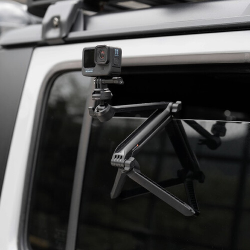 Hang the MantisPod Z from fences, monitors, and other surfaces to create unique shooting angles. Mantis Mode can only be used on surfaces 3.5" thick or less and when all three legs are supported. Avoid using Mantis Mode on moving vehicles.